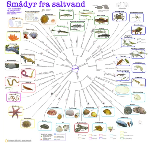 Bestemmelsesdugen til saltvandsdyr er en kvadratisk dug i kraftigt, hvidt vinylmateriale, måler 110 x 110 cm og er trykt med farveillustrationer af dyr, som findes ved danske havnemoler og strande. Dyrene er sat op pædagogisk og systematisk, så det bliver nemmere at identificere og klassificere de forskellige arter sammen med dine elever.