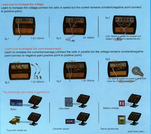 Sættet kan bruges til at demonstrere, hvordan solenergi kan omdannes til elektrisk energi, der driver forskellige apparater. Elever kan observere, hvad der sker, når solcellen udsættes for lys, og skifte mellem komponenterne for at se effekten på en motor, en lydgiver eller en pære. Det giver en praktisk forståelse af solcellers funktion og energioverførsel.